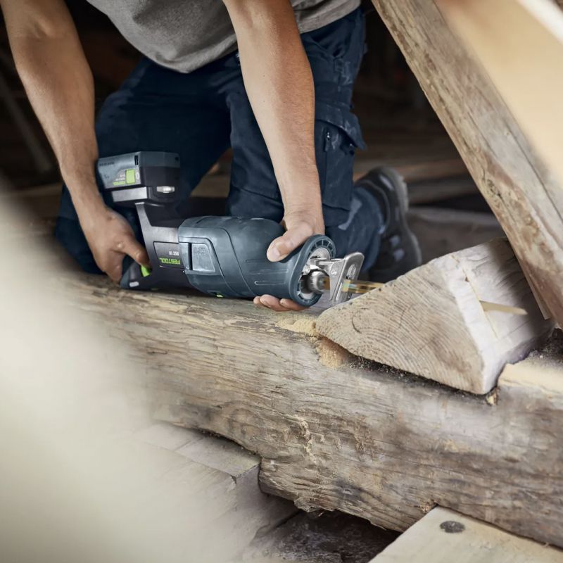The Festool RSC 18 cordless reciprocating saw is engineered for powerful, fast cutting across demanding construction, renovation and dismantling applications. Its brushless EC-TEC motor and switch-activated pendulum stroke deliver rapid cutting performance while directing maximum power straight into the blade rather than the machine body.