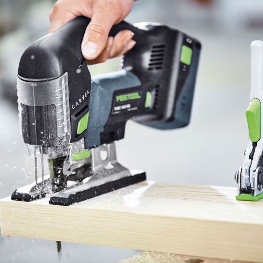 With excellent behaviour in curves thanks to a threefold saw blade guide and rigid lifter rod, this jigsaw offers optimal control. Its softgrip, ergonomic design and electronic switch-on/off on both sides enable effortless handling, while tool-free changes of tables, baseplates, and saw blades ensure convenience.