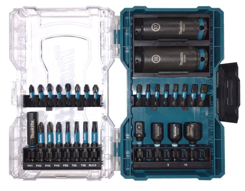Impact Black 30 piece screw bit set for drivers in a clear cover case. Set contains 23 Impact Black screw bits, 3 E-Form nutsetters, 2 impact sockets, 1 magnetic bit holder and 1 socket adapter.