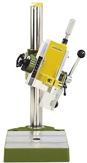 Head tilts through 90°, thus offering a multitude of capabilities: Diagonal drilling, versatile milling without need of special milling bits, milling of diagonal slots. Fine feed selectable allowing fine head feed for milling. With dial and depth scale. Geared rack and pinion feed for effortless drilling. 45mm diameter drill column, 500mm long. Approx. 140mm throat (column outside to tool centre). 65mm stroke. Plane-milled, solid base plate approx. 200 x 200mm with two continuous MICROMOT standard T-slots (12 x 6 x 5mm). Easy clamping of all common drills with standard 43mm spindle collar. Weight approx. 6.5kg.