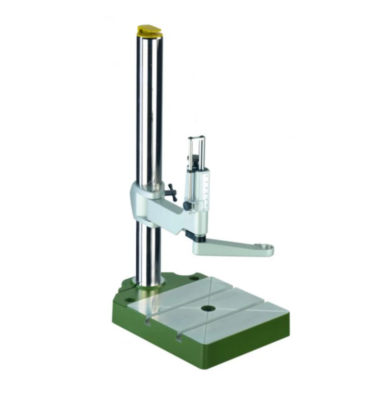 With two-way pivotable articulated arm and 20mm standard collar. Once the device is clamped, it always remains vertically aligned. This means that, e.g. drill holes are always exactly perpendicular to the work piece surface! Preselectable drill depth using depth control with easy-to-read scale. After drilling, an adjustable spring automatically pulls the device back into its top rest position. Plane-milled solid base plate with 200 x 200mm usable table area and two continuous MICROMOT standard T-slots (12 x 6 x 5mm). Stable drill column (Ø 45mm, 500mm long).