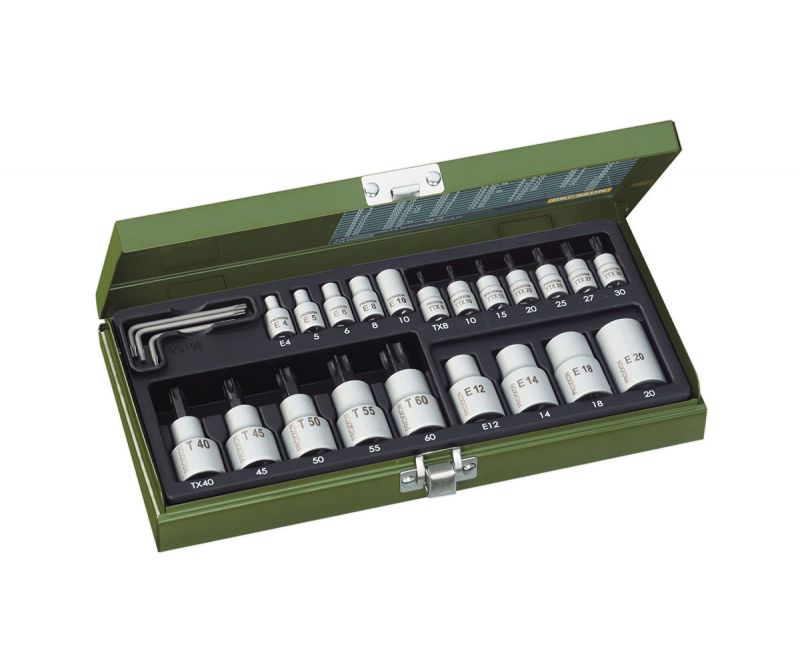 This set contains 1/4'' drive (6.3mm) TX sockets in sizes TX8 to TX30 (with frontal hole) and external TX sizes E4 to E8 (all suitable for tightening torques up to 25Nm), 1/2'' drive (12.5mm) TX sockets in sizes TX40 - 60 and external TX E10 to E18 (for tightening torques from 25 to 135Nm) and three offset TX spanners - the TX6, 8 and 10.