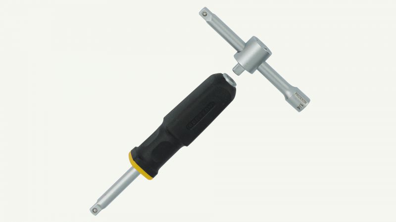 The ratchet - the key item. Made from CrV steel in one single piece. Hardened and with perfect toothing: several of the 72 teeth engage simultaneously for transmitting extremely high torque. Quick release mechanism: releasing sockets at the push of the button.