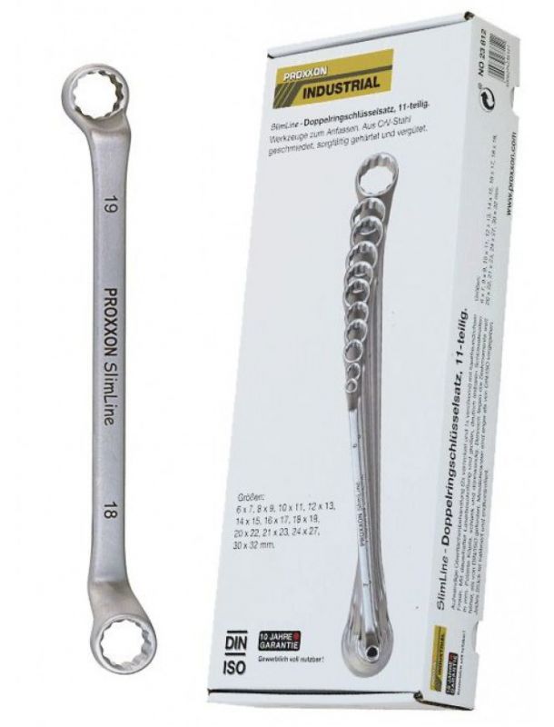 Slim-Line 11-piece ring spanner. Conforms to DIN 3110 and ISO 3318 standards. Includes wrenches:6 x 7, 8 x 9, 10 x 11, 12 x 13, 14 x 15, 16 x 17, 18 x 19, 20 x 22, 21 x 23, 24 x 27 and 30 x 32mm.