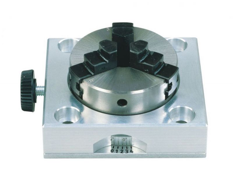 For machining circular work pieces, manufacturing off-set holes and milled out portions, milling key surfaces, four-sided, sixsided materials, etc. Absolute accurate division due to nonius at the base body. With reversed chuck jaws: Capacity inside 1.5 to 32mm, outside 12 to 65mm. Bore of 11mm (for processing longer spindles in a vertical position). With fastening bores for horizontal and vertical mounting and suitable slot nuts and fastening screws for mounting to the MICRO miller MF 70 and the MICRO compound table KT 70. Size 72 x 64 x 38mm. In wooden box with sliding lid.