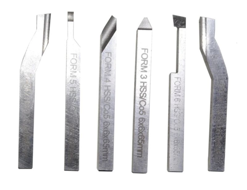One each boring, roughing out, parting, finishing, right and left cutter. Size 6 x 6 x 65mm. Supplied in wooden box.
