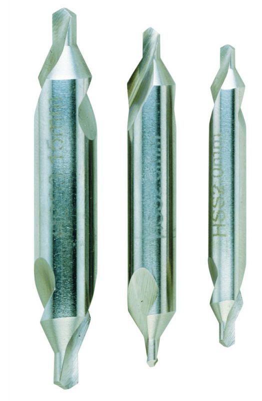 Made of HSS steel. DIN 333 (type A) 60°. Complete set centre drills with sizes of 2 - 2.5 and 3.15mm.