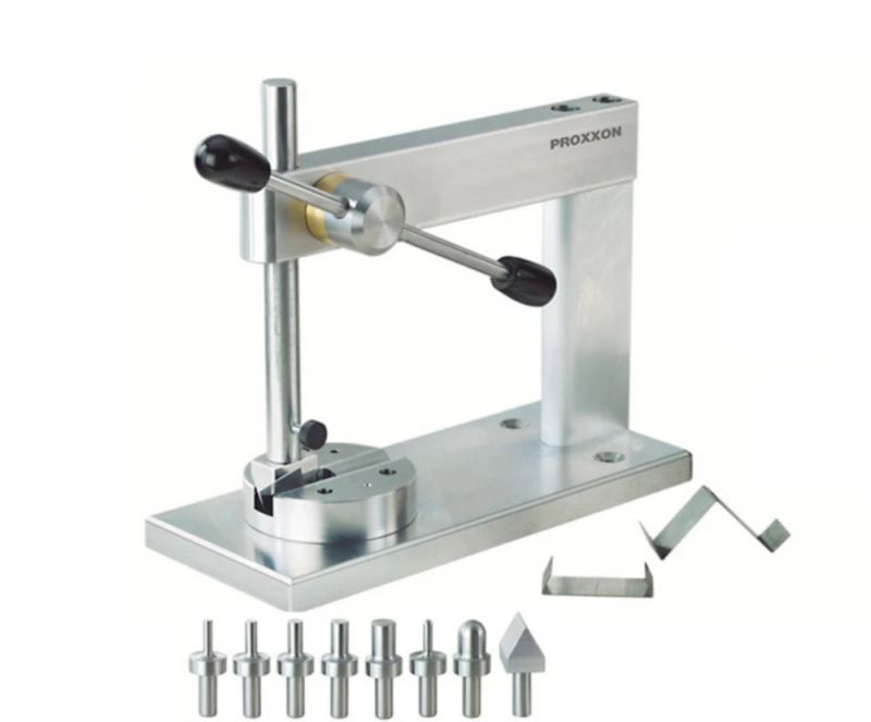 With 5 cylindrical pressing tools (surface hardened) being inserted into the toothed rack and fixed with a knurled screw: Ø 3 - 4 - 5 - 6 and 8mm. One each semi-spherical profile Ø 3 and Ø 9mm as well as a 60° square prism for bending sheet metal. The counterpart is an easily adjustable, hardened revolving plate with all required holes and bottom dies for the above-specified pressing tools.