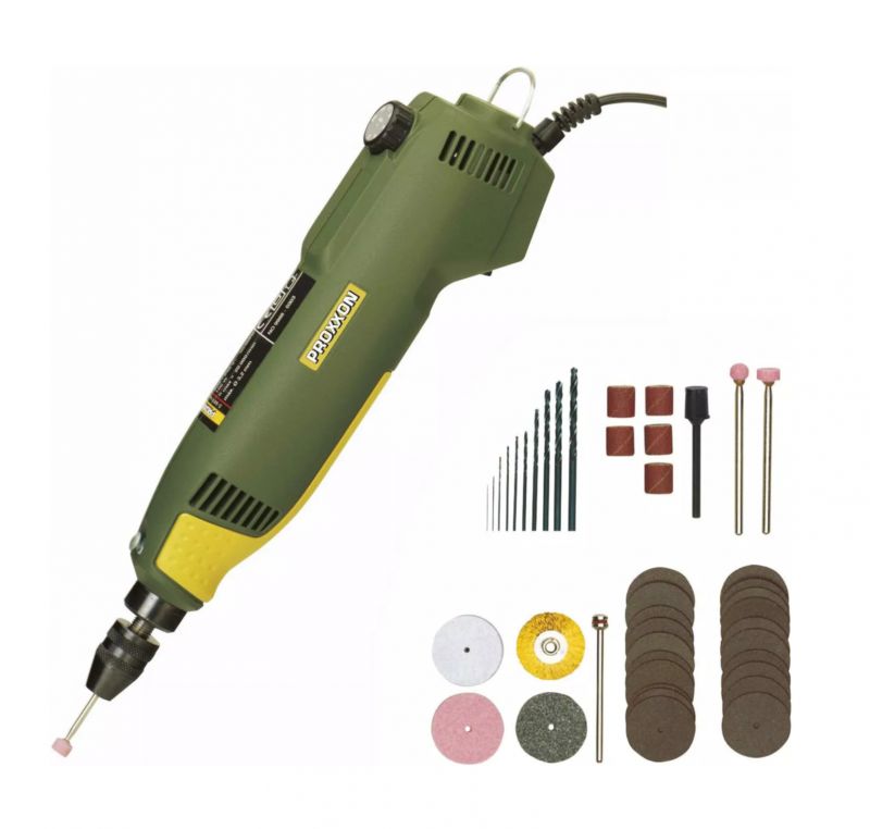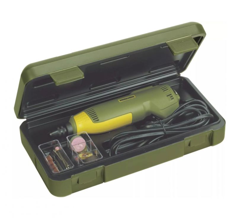 The maximum speed of 22,000rpm is continuously variable down to 5,000rpm. The full wave electronic speed control results in virtually constant torque, even at lower speeds, in turn facilitating micro drilling, cleaning and polishing. The spindle runs in a precision ball bearing and is lifted with a lock button. The 20mm collar fits MICROMOT drill stands and vices. The machine is fitted with a special, balanced, low noise DC motor with high life expectancy. Stable housing of glass-fibre reinforced POLYAMIDE with soft components in the finger grip area. Complete with 43 quality inserts in a sturdy plastic case.