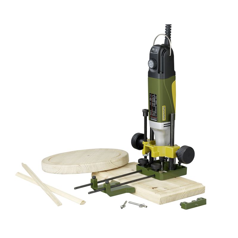 Regardless whether with parallel limit stop (maximum throat 150mm), for circular milling with centring pin (100 - 400mm) or freehand. Of die-cast aluminium with plane-milled bearing surface. Adjustable depth control with preselectable stroke. Also ideal as drilling guide for round parts through prism in the guiding plate.
