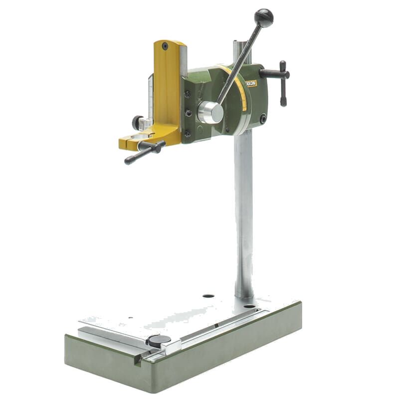Geared rack and pinion feed with return spring allowing effortless and sensitive operation. Practical drill depth scale with adjustable limit stop (maximum travel 40mm). With standard 20mm collar for MICROMOT drilling and milling devices. With solid, hard chromium-plated steel column (280 x 20mm), throat capacity (column inside to centre of tool) 140mm.
