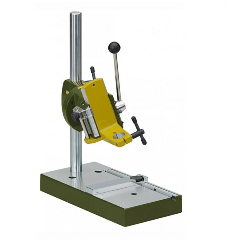 Geared rack and pinion feed with return spring allowing effortless and sensitive operation. Practical drill depth scale with adjustable limit stop (maximum travel 40mm). With standard 20mm collar for MICROMOT drilling and milling devices. With solid, hard chromium-plated steel column (280 x 20mm), throat capacity (column inside to centre of tool) 140mm.