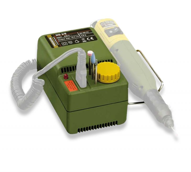 Polarised socket for MICROMOT plug. Red LED indicates readiness for use. PTC (Positive temperature coefficient) element prevents overload (and plugged in tool will not automatically restart). After cooling down the mains plug should be disconnected briefly to reset the adapter. With holes for storing bits. Foldable tool rest provides a secure place for keeping the MICROMOT tools at the ready. Variable speed control with feedback effect for adjusting bit speed to suit the job, as well as providing high torque at low speeds.