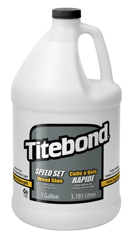 Titebond Speed Set Wood Glue is an extremely fast-setting, high solids PVA adhesive. It provides exceptional gap filling properties developing a bond stronger than the wood itself. This product offers excellent sandability, unaffected by finishes, and increases productivity through its shorter clamp time with no increase in viscosity. Titebond Speed Set cleans up with water.