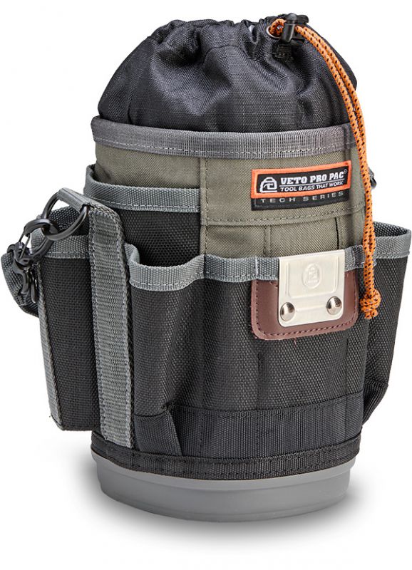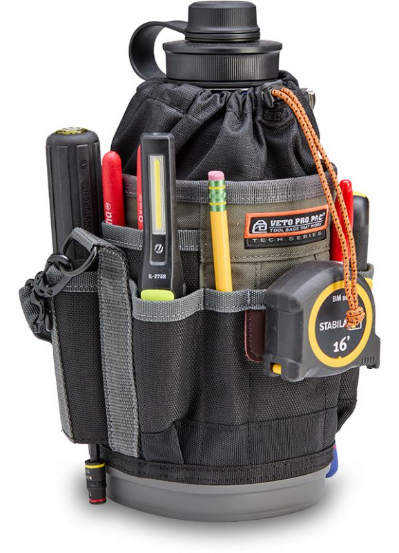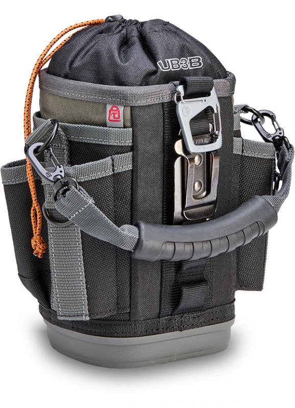 The UB3B is a large, compact utility bag featuring an expandable or closeable cinch-top bulk storage compartment with a with a water/oil resistant interior for easy clean up, perfect for storing hand tools, test equipment, a drill, a water bottle (up to 4.5” diameter), a soldering tank, etc. Built to handle any environment, it’s equipped with an impact and water-resistant, injection-molded base that keeps the bag standing. For added versatility, the UB3B features a stainless- steel tape measure clip and 8 external pockets: 2 pass-through pockets and 2 large sleeve pockets for large hand tools, 2 standard pockets for smaller tools, and 2 small pockets for a pen, pencil or drill bits. It also comes with a detachable over-molded grip handle, a Repositionable Belt Clip (RBC) for securing the bag to a belt or larger tool bag, and a dual-gated carabiner for an alternative attachment option.
