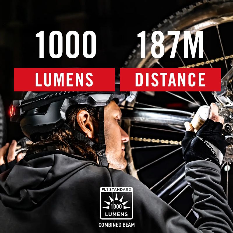 Stay visible with a rear safety light solid or flashing red independently controlled and built into the battery pack on the head strap’s back.