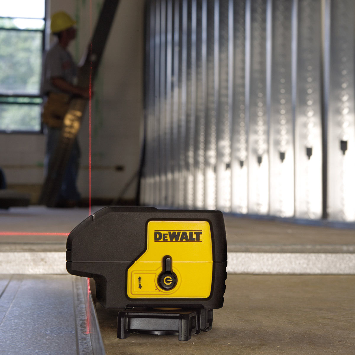 The DW083K 3 Beam Laser Pointer includes a single lever power switch that locks the pendulum in the off position for added durability and the built-in magnetic pivoting bracket mounts easily on metal surfaces.