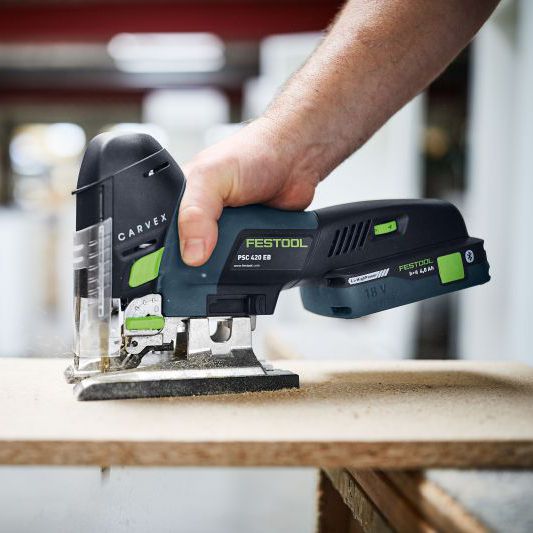 The PSC 420 EB-Basic delivers perfect handling on tight curves thanks to its high-performance EC-TEC motor and threefold saw blade guide. Its ergonomic design, softgrip, and electronic switch-on/off controls provide comfort and control for prolonged work.