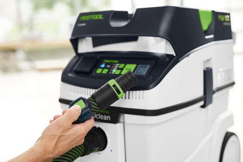 The CTM 36 EI AC offers highly effective automatic filter cleaning (AUTOCLEAN) for consistently strong suction, longer working intervals, and extended filter life with minimal maintenance. Touch control and Bluetooth® connectivity allow intuitive operation and integration with the Festool app for adjusting cleaning intervals. The anti-static, smooth suction hose ensures high efficiency and smooth operation. T-LOC enables fast installation of Systainers on the extractor.