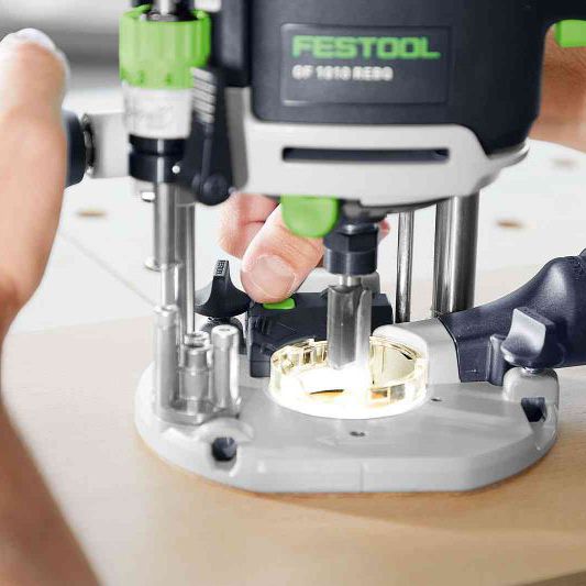 An integrated LED light ring built into the base plate delivers shadow-free lighting directly onto the workpiece, giving a clear view of the router bit and scribe line. Combined with a routing depth adjustment accurate to 1/10 mm, the OF 1010 allows professionals to achieve extremely precise routing results.