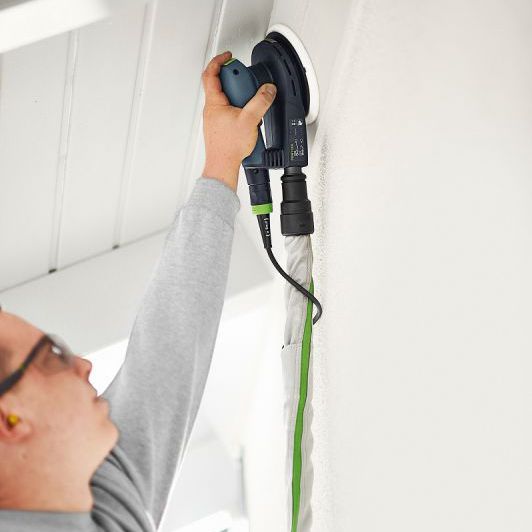 The Festool ETS EC 150/5 EQ-SYS is designed for comfortable manual operation, with reduced fatigue during overhead sanding and excellent feel on edges. Its ergonomic housing, brushless EC-TEC motor, and compact 116 mm height provide perfectly balanced operation in any position. Additional features like automatic dust control, integrated sanding pad brake, and Vibration Control System ensure safe, smooth sanding.