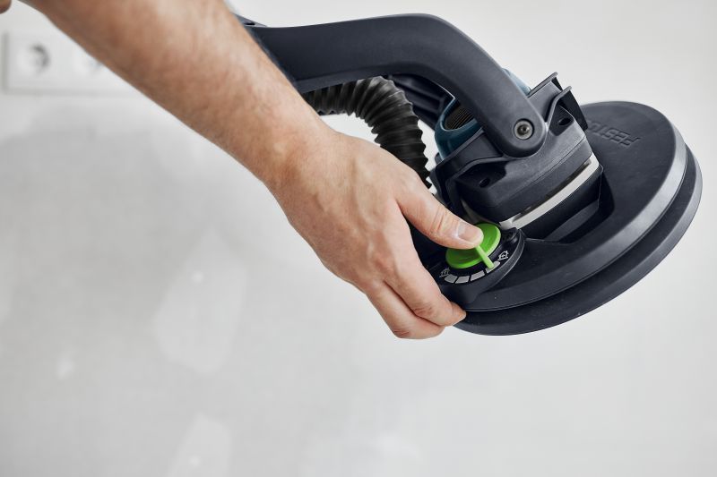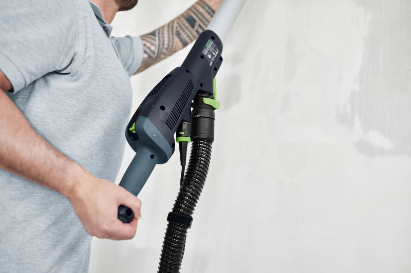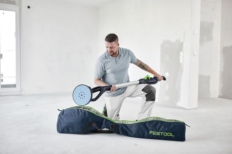 The PLANEX M is the all-rounder of our long-reach sanders. Simply unpack the sander from the transport bag, switch it on and get to work. Its eccentric sanding motion achieves a high surface quality on walls and ceilings. The adjustable suction power means that you can sand on walls and ceilings without tiring – reducing the strain on your arms and back. Its working length of 1.4 m is ideal for all standard room heights. What's more, the practical T-shaped handle even provides additional reach.