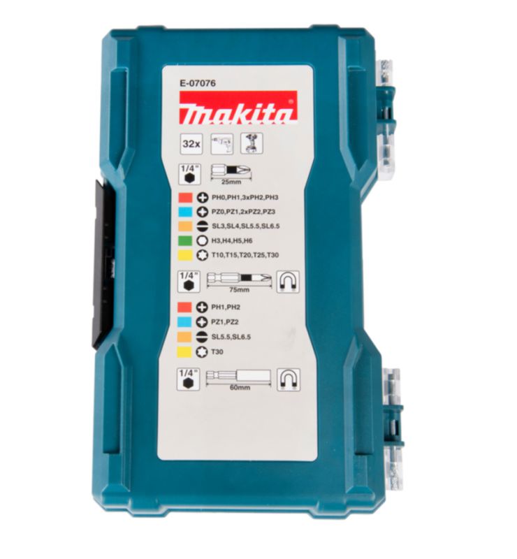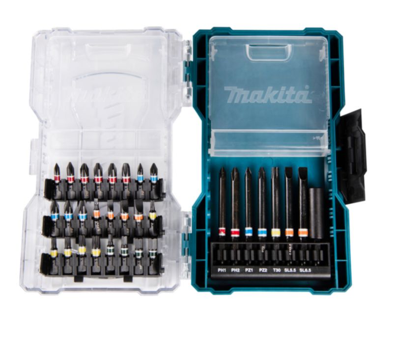 24 x 25mm screw bits - sizes: PZ0, PZ1, PZ2 x 2, PZ3, PH0, PH1, PH2 x 3, PH3, SL0.5x3, SL0.5x4, SL0.8x5.5, SL1.2x6.5, T10, T15, T20, T25, T30, HEX3, HEX4, HEX5 & HEX6;