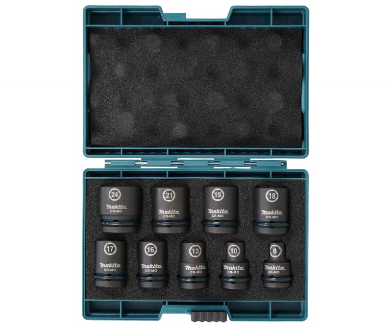 Set Contains 9 impact sockets with 1/2" connection in sizes 8,10, 13, 16,17, 18, 19, 21 & 24mm.