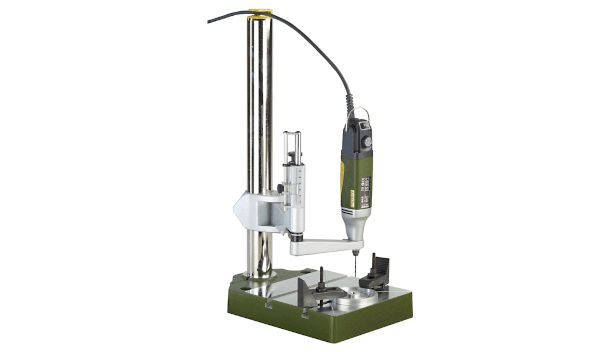 With two-way pivotable articulated arm and 20mm standard collar. Once the device is clamped, it always remains vertically aligned. This means that, e.g. drill holes are always exactly perpendicular to the work piece surface! Preselectable drill depth using depth control with easy-to-read scale. After drilling, an adjustable spring automatically pulls the device back into its top rest position. Plane-milled solid base plate with 200 x 200mm usable table area and two continuous MICROMOT standard T-slots (12 x 6 x 5mm). Stable drill column (Ø 45mm, 500mm long).