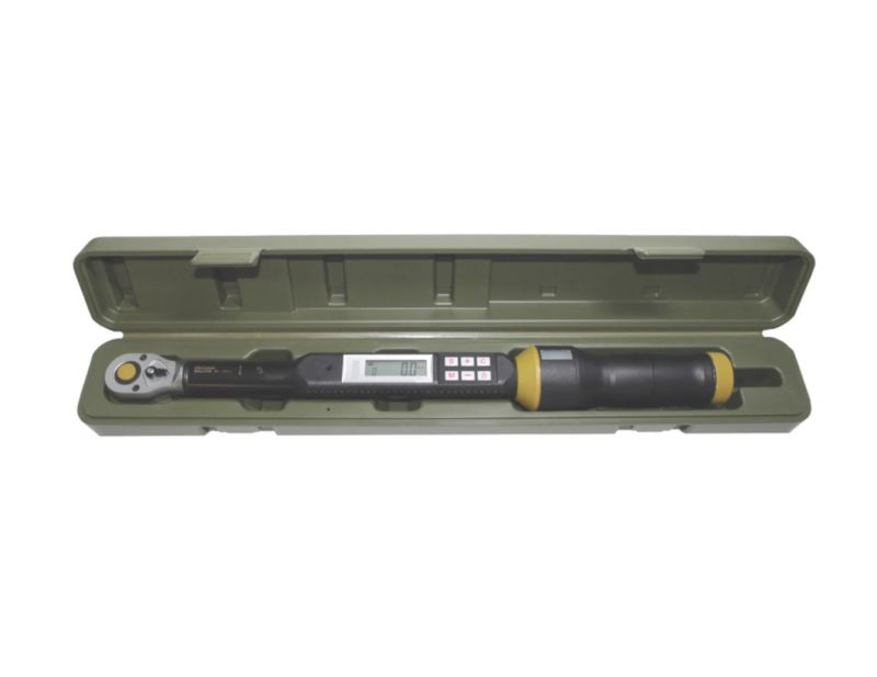 Ratchet mechanism with reverse lever. Digital display of preselect torque and measured values. Preselection of 10 different torques and 5 measuring tolerances (1 - 9%) is possible. Clearly signalised by visual, audible and sensorial (vibration) signal. Bluetooth interface for connection with smartphone or tablet for documentation of the measured values via app. Piece by piece calibration and final inspection. Including 3 AAA-type batteries for immediate use.