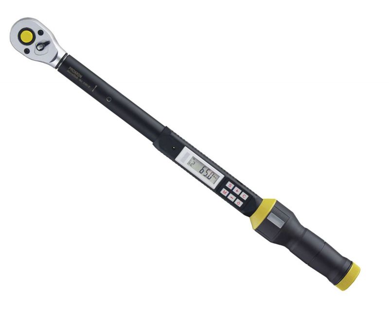 Ratchet mechanism with reverse lever. Digital display of preselect torque and measured values. Preselection of 10 different torques and 5 measuring tolerances (1 - 9%) is possible. Clearly signalised by visual, audible and sensorial (vibration) signal. Bluetooth interface for connection with smartphone or tablet for documentation of the measured values via app. Piece by piece calibration and final inspection. Including 3 AAA-type batteries for immediate use.