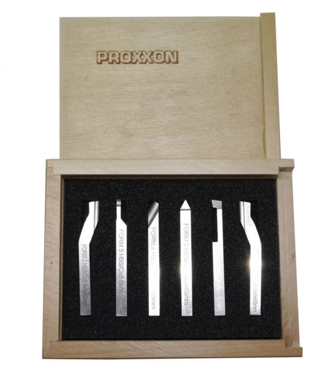 One each boring, roughing out, parting, finishing, right and left cutter. Size 6 x 6 x 65mm. Supplied in wooden box.