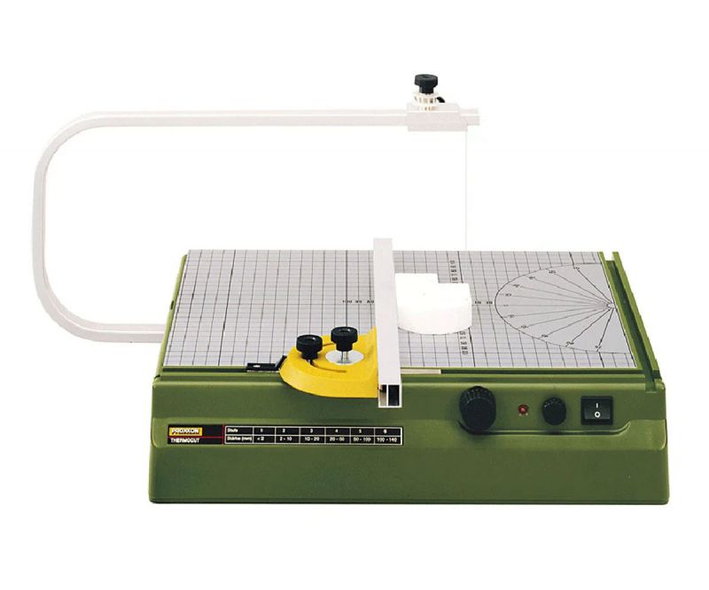 The large base with 390 x 280mm table with surface of aluminium cobond compound ensures smooth and easy movement of the workpiece. The printed grid and protractor ease division and cutting. The solid aluminium overarm has a 350mm throat and offers 140mm capacity in height. The holder and wire coil (30m, 0.2mm diameter is included) may be shifted along the overarm to enable mitre cutting. A LED indicates operation and prevents burnt fingers (the cutting wire heats to maximum in less than 1 second).