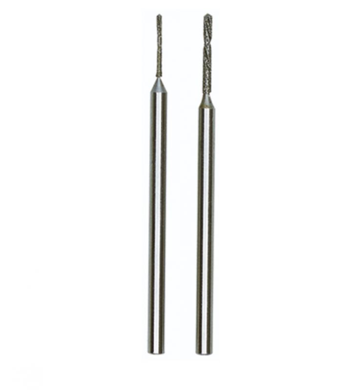 The 2.35mm (3/32") diameter shafts are made from stainless steel. Sold as a pack of two bits, one 0.8mm diameter the other 1.2mm both with an effective length of 5.0mm. Used for drilling holes in semi-precious stones, jewellery making etc.