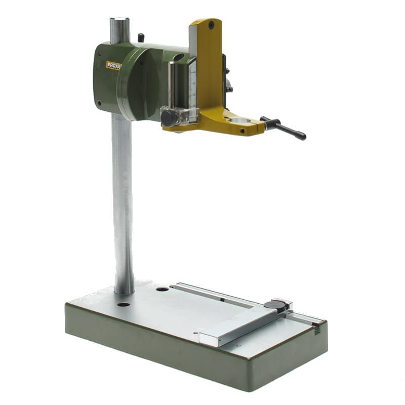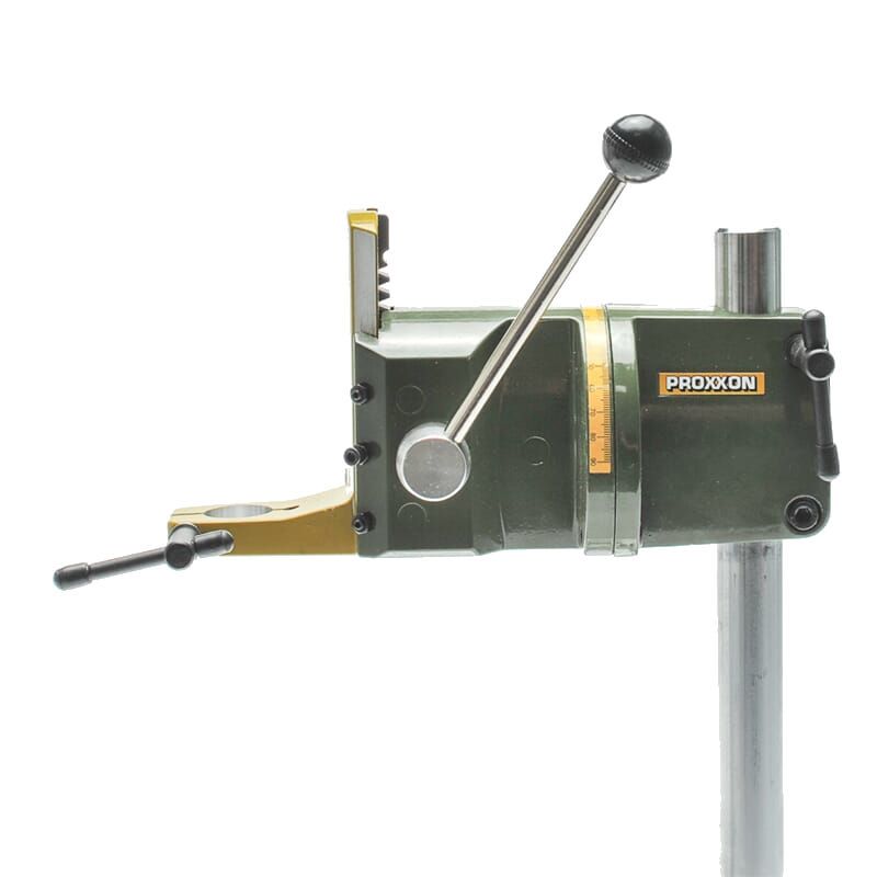 Geared rack and pinion feed with return spring allowing effortless and sensitive operation. Practical drill depth scale with adjustable limit stop (maximum travel 40mm). With standard 20mm collar for MICROMOT drilling and milling devices. With solid, hard chromium-plated steel column (280 x 20mm), throat capacity (column inside to centre of tool) 140mm.