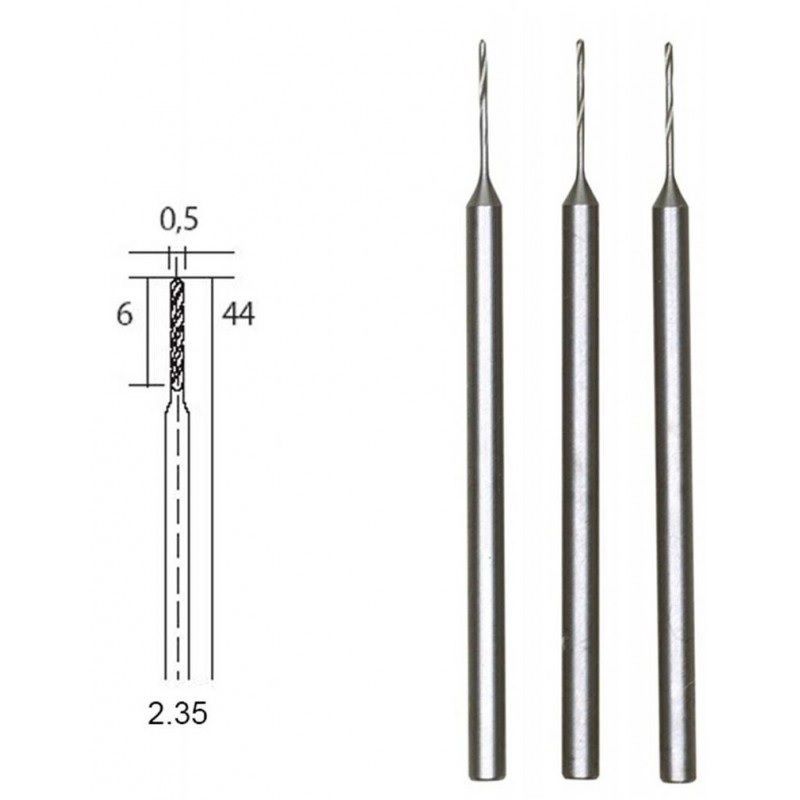 Selected steel quality. Purpose-made stable construction with high concentricity. Shaft and bit are manufactured from a one-piece blank. High hardness for optimum life expectancy and elasticity. For drilling metal, non-ferrous metals, plastic, PC cards and wood. Work speeds: soft materials approx. 8,000rpm, hard materials approx. 3,000rpm. Ø shanks 2.35mm.