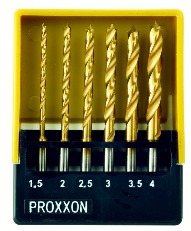 6-piece set. Ø 1.5 - 2.0 - 2.5 - 3.0 - 3.5 - 4.0mm. For precision tapping of wood and plastics; also non-ferrous metal, steel and stainless steel sheets. Titanium coating reduces friction and increases service life. Shaft Ø 3mm, 6-piece set.