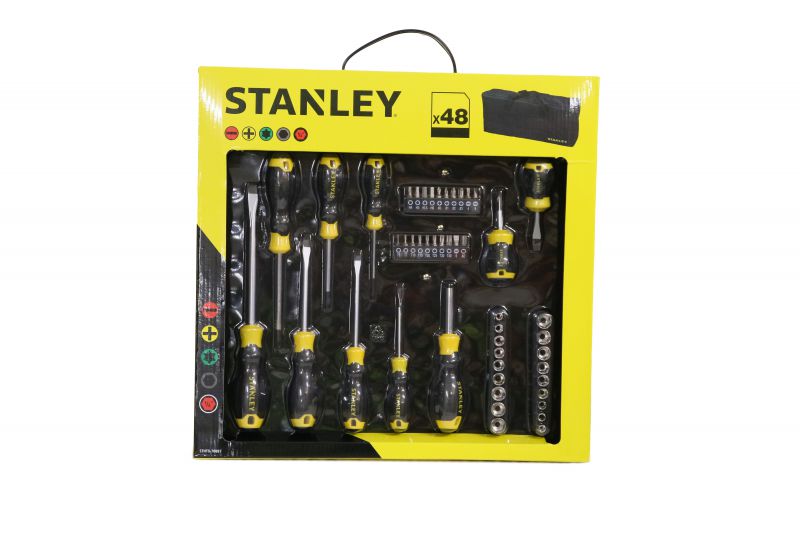 Constructed with a soft grip handle, the STANLEY® Screwdriver Set in Bag Set of 48 pc, is built for exceptional comfort, especially when carrying out repetitive professional work. Engineered from high-strength, chrome vanadium steel to reduce the chance of tip breakage, this high quality screwdriver set is suitable for demanding high torque applications. The STANLEY® Screwdriver Set in Bag Set of 48 pc. is designed to improve screw retention, and at the same time, enhance durability, reliability and product life. The handle is moulded directly to the bar for extra strength and a virtually unbreakable bond. And thanks to the clearly-marked tip ID on the handle, users can easily identify the correct screwdriver for each job.