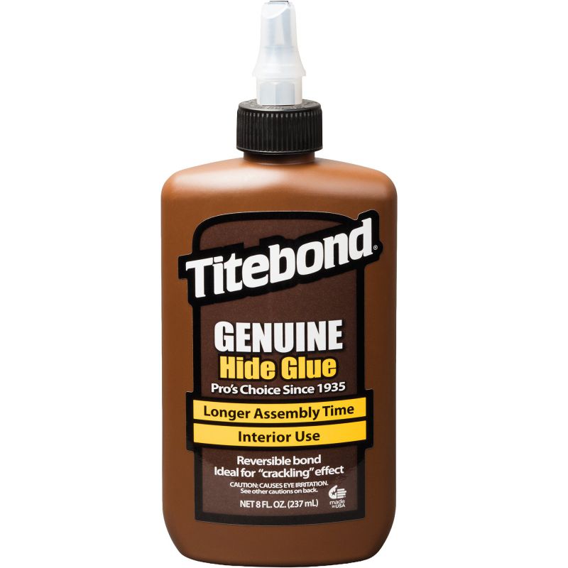Titebond Genuine Hide Glue is the first hide glue to be offered in a liquid, ready-to-use form. It requires no mixing, heating or stirring. Professional woodworkers use Titebond Genuine Hide Glue for its long assembly time, exceptional strength and unique crackling effect on wood. Titebond Genuine Hide Glue provides superior creep-resistance, offers excellent sandability and is unaffected by finishes. Its sensitivity to moisture allows for easy disassembly of parts, a critical benefit in antique restoration or the repair of musical instruments.