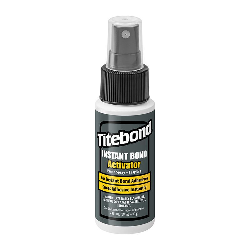 Titebond Instant Bond is a two-part bonding system that takes between 5 – 15 seconds to set and 30 – 60 seconds for initial cure. It provides a strong, permanent bond and is ideal for hard to reach joints or surface areas that are difficult to clamp. Designed primarily for wood and wood products, this adhesive is also very effective on a wide variety of materials and substrates. Instant Bond Activator is used to accelerate the curing of all Titebond Instant Bond Adhesives. The Activator is especially effective for large gaps, very porous woods and bridge bonding joints, bonding acidic surfaces or in low humidity conditions. It is a heptane-based solvent that will not mar finishes or damage plastics.