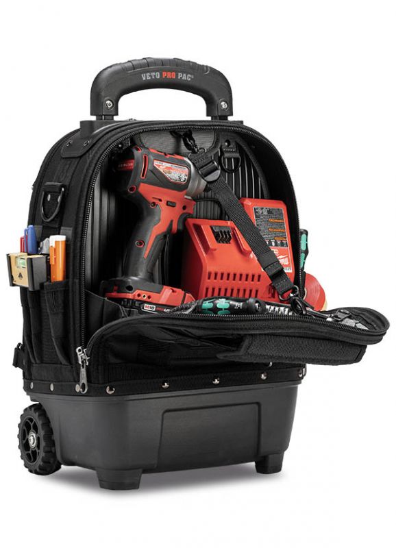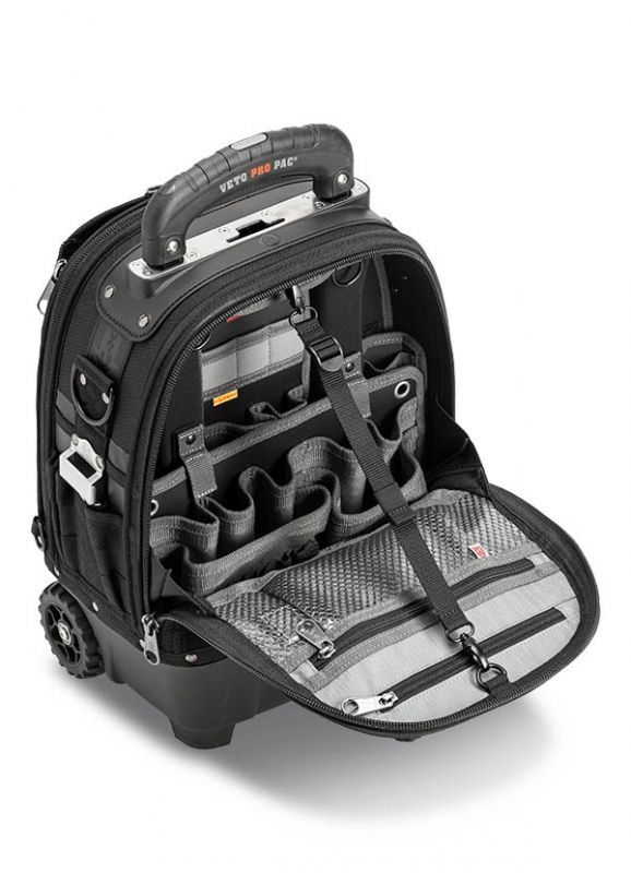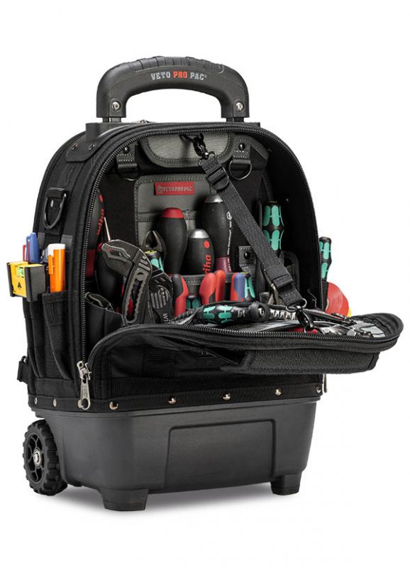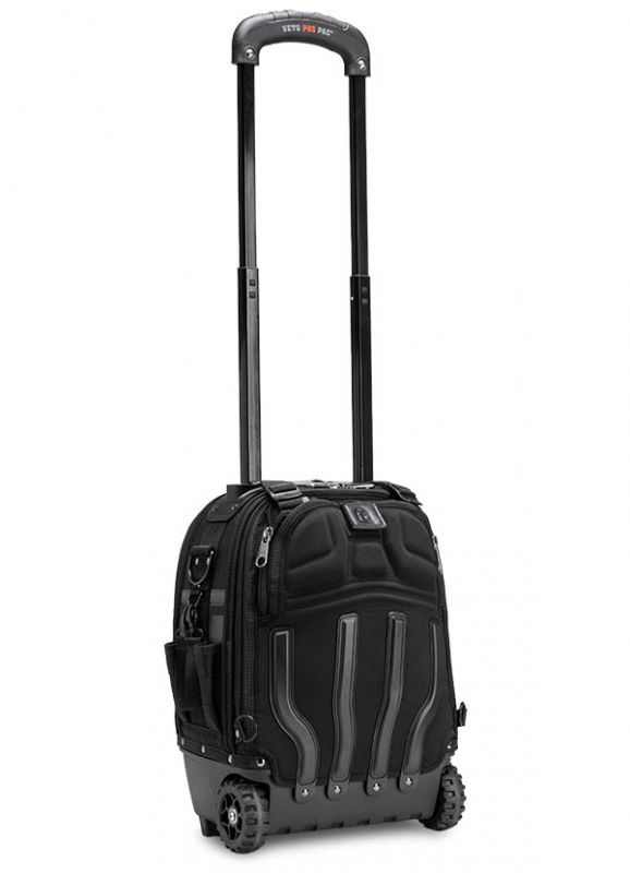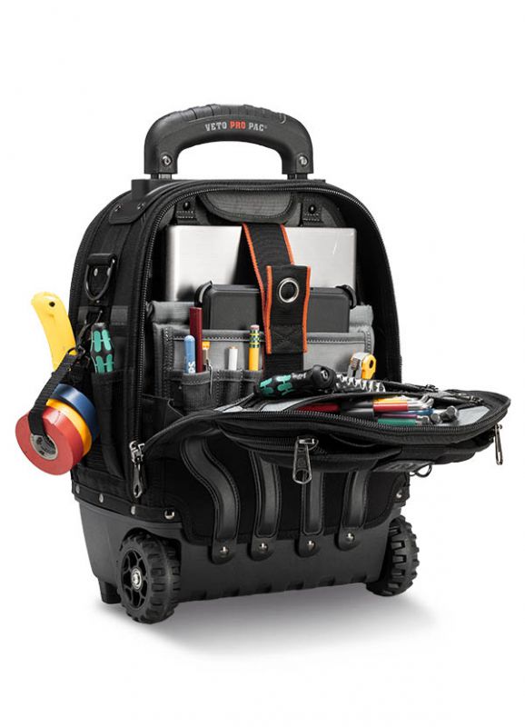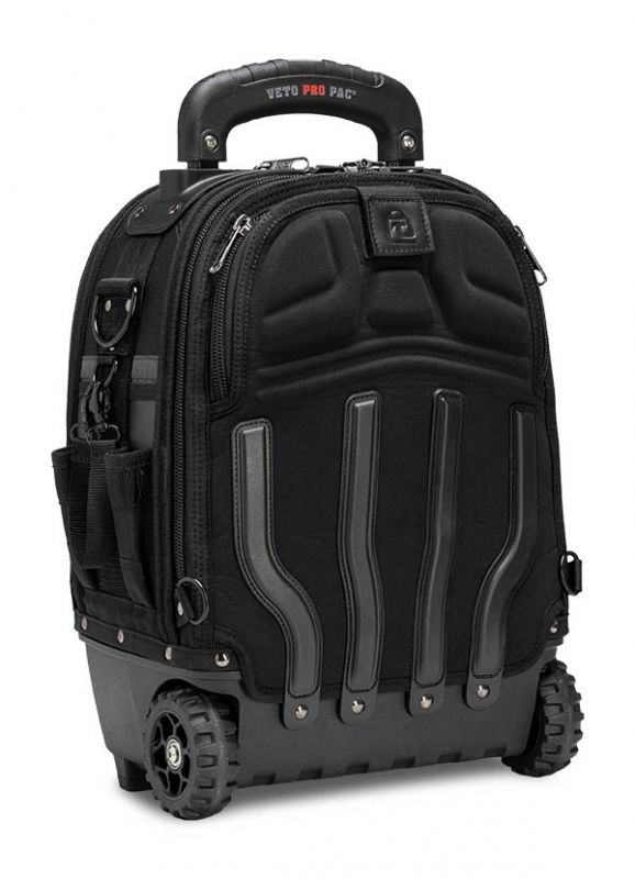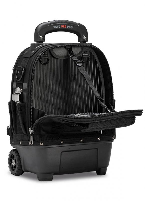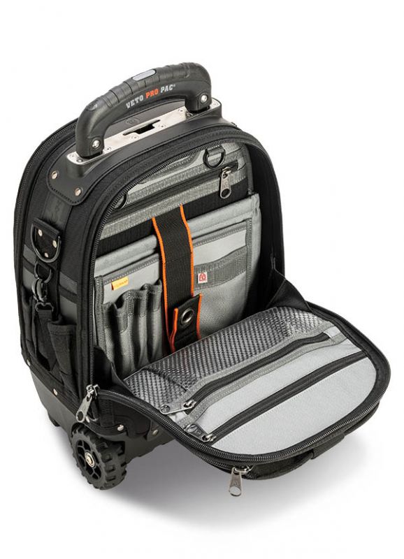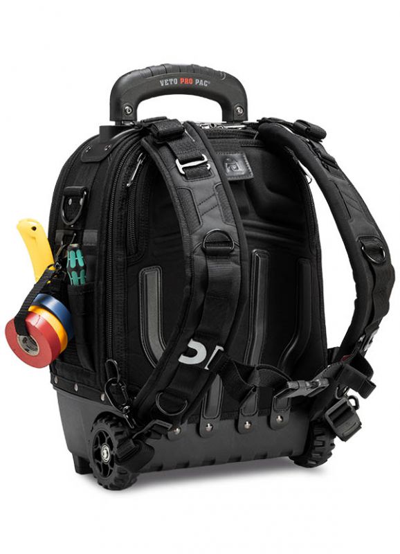 The TECH PAC WHEELER BLACKOUT is a rolling version of the best-selling TECH PAC BLACKOUT backpack tool bag with an all-black colorscheme. This wheeled backpack includes new premium padded backpack straps that are completely removable. This makes stowing the backpack straps easier and allows you to choose whether the bag can function as a backpack or not. The TECH PAC WHEELER BLACKOUT also features the V-SWAP system. Includes the Tool Panel (included and mandatory) and Meter Panel. Other panels sold separately as shown below.