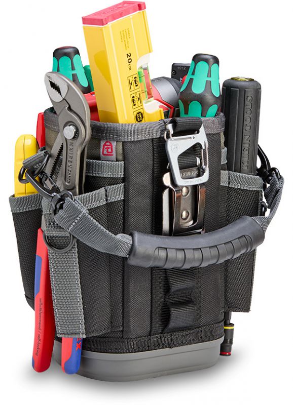 The UB3B is a large, compact utility bag featuring an expandable or closeable cinch-top bulk storage compartment with a with a water/oil resistant interior for easy clean up, perfect for storing hand tools, test equipment, a drill, a water bottle (up to 4.5” diameter), a soldering tank, etc. Built to handle any environment, it’s equipped with an impact and water-resistant, injection-molded base that keeps the bag standing. For added versatility, the UB3B features a stainless- steel tape measure clip and 8 external pockets: 2 pass-through pockets and 2 large sleeve pockets for large hand tools, 2 standard pockets for smaller tools, and 2 small pockets for a pen, pencil or drill bits. It also comes with a detachable over-molded grip handle, a Repositionable Belt Clip (RBC) for securing the bag to a belt or larger tool bag, and a dual-gated carabiner for an alternative attachment option.